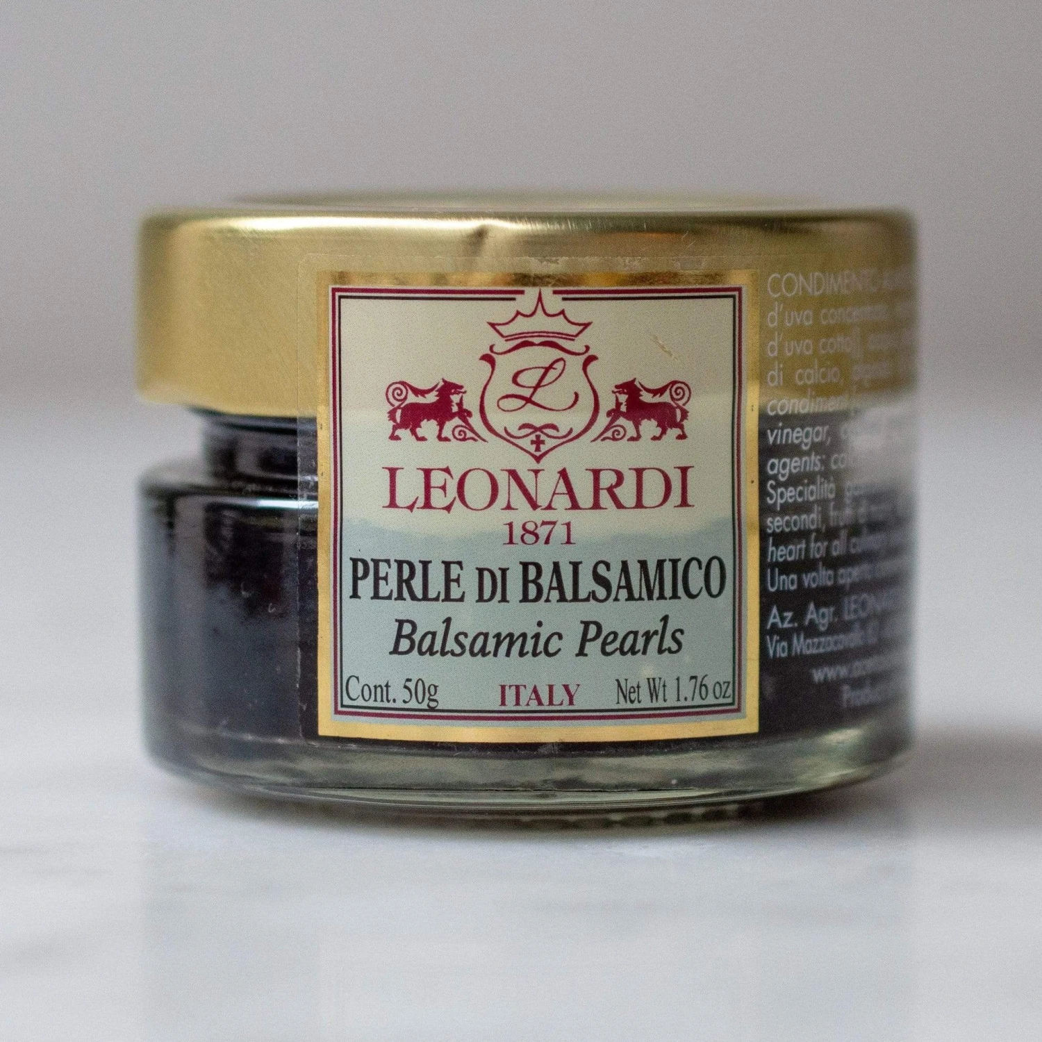 [/description-break] Ingredients [/title] Balsamic condiment; water; cellulose gum as thickener; calcium chloride, sodium alginate as gelling agents. Contains sulphites. Warning: California Proposition 65: This product contains chemicals known to the state of California to cause cancer and birth defects or other reproductive harm. [/accordion] Specifications [/title] Net Weight: 1.76 ounces Place of Origin: Modena, Italy [/accordion] CARE AND USE [/title] N/A [/accordions-break] In a nod to modern food trends in molecular gastronomy, family producer Acetaia Leonardi in Modena, Italy, uses a gelling agent to encapsulate the classic sweet-tart acidity of balsamic vinegar in these innovative pearls, which make tasting balsamic a more vivid and intense experience. [/banner-text-break] Balsamic Pearls are a perfect counterpoint to rich Italian soups and stews, braised meats, risotto and pasta. Try sprinkling over braised greens or pair with Parmesan curls on bitter greens, like radicchio.Or scatter a few over roasted winter squash seasoned with butter, nutmeg and sage [/how-to-use-break]Acetaia Leonardi Balsamic Pearls