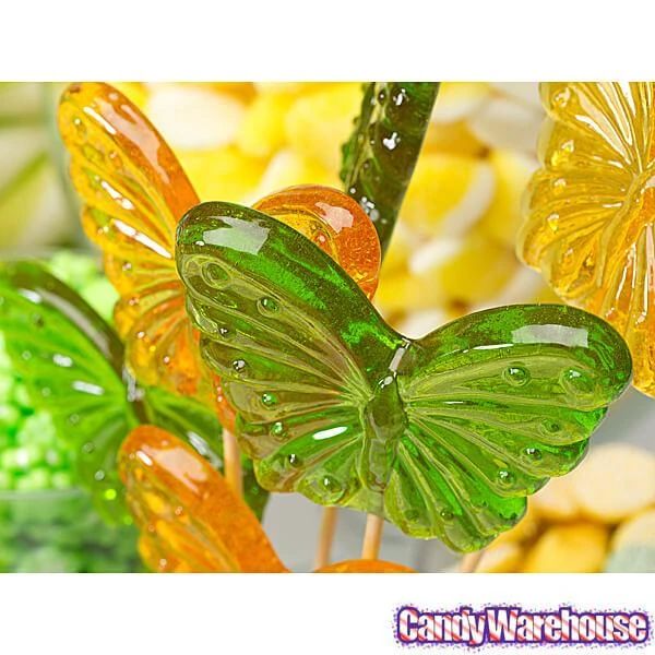 Humble candy caterpillars inch along through the world, endeavoring to spin themselves into confectionery cocoons and then emerge, transformed into resplendent Hard Candy Butterflies. Candy Elves prance through bountiful meadows, armed with nets, endeavoring to capture the beautiful and elegant Hard Candy Butterflies. Such is the candy circle of life. Enjoy the detailed, exquisite Hard Candy Butterfly Lollipops in three translucent colors: Red, Yellow and Green. These fluttery confectionery creatures come mounted on a long wooden stick, perfect for use in candy flower arrangements.