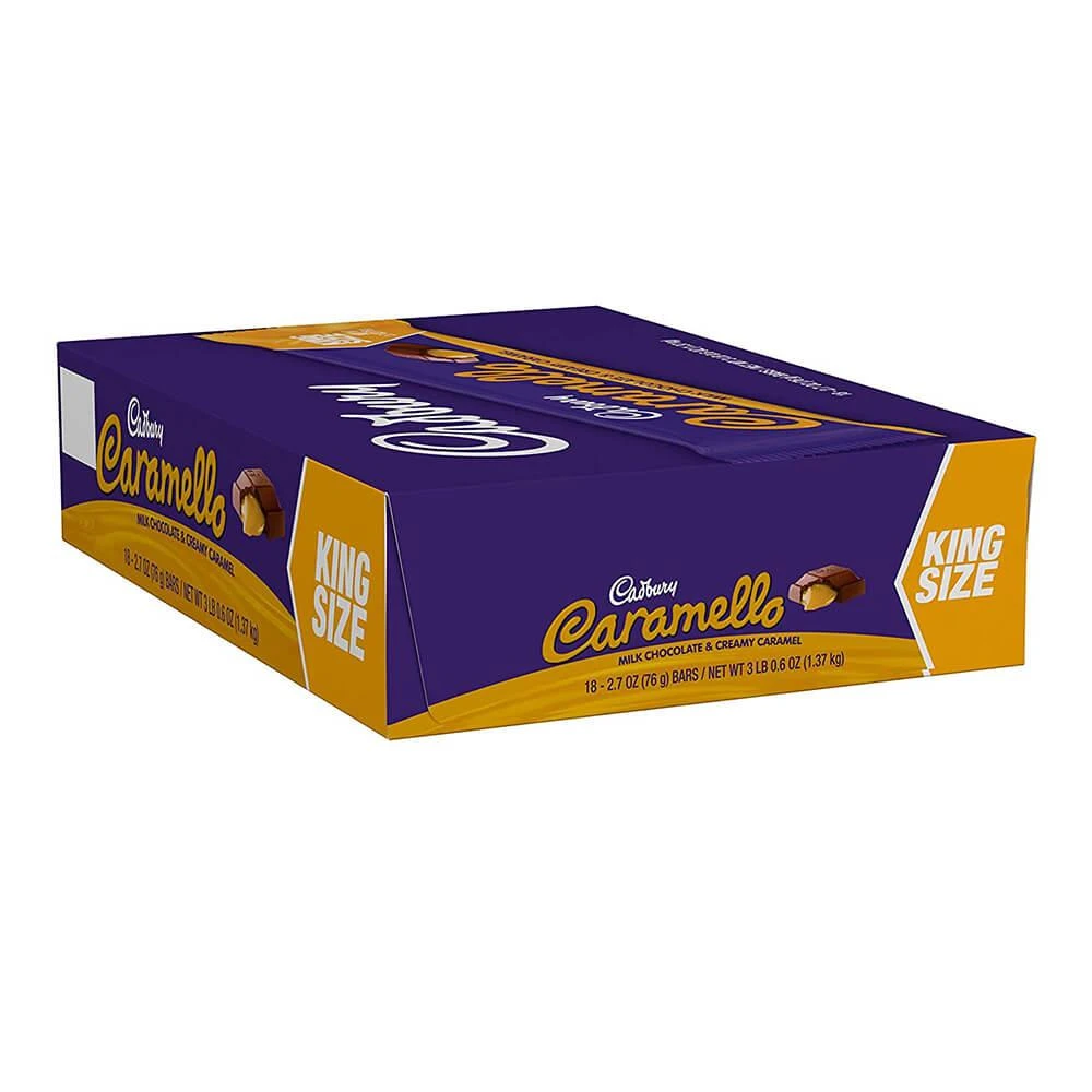 Display box contains 18 Cadbury Caramello King Size Candy Bars. Each chocolate and caramel candy bar has a net weight of 2.7 ounces.