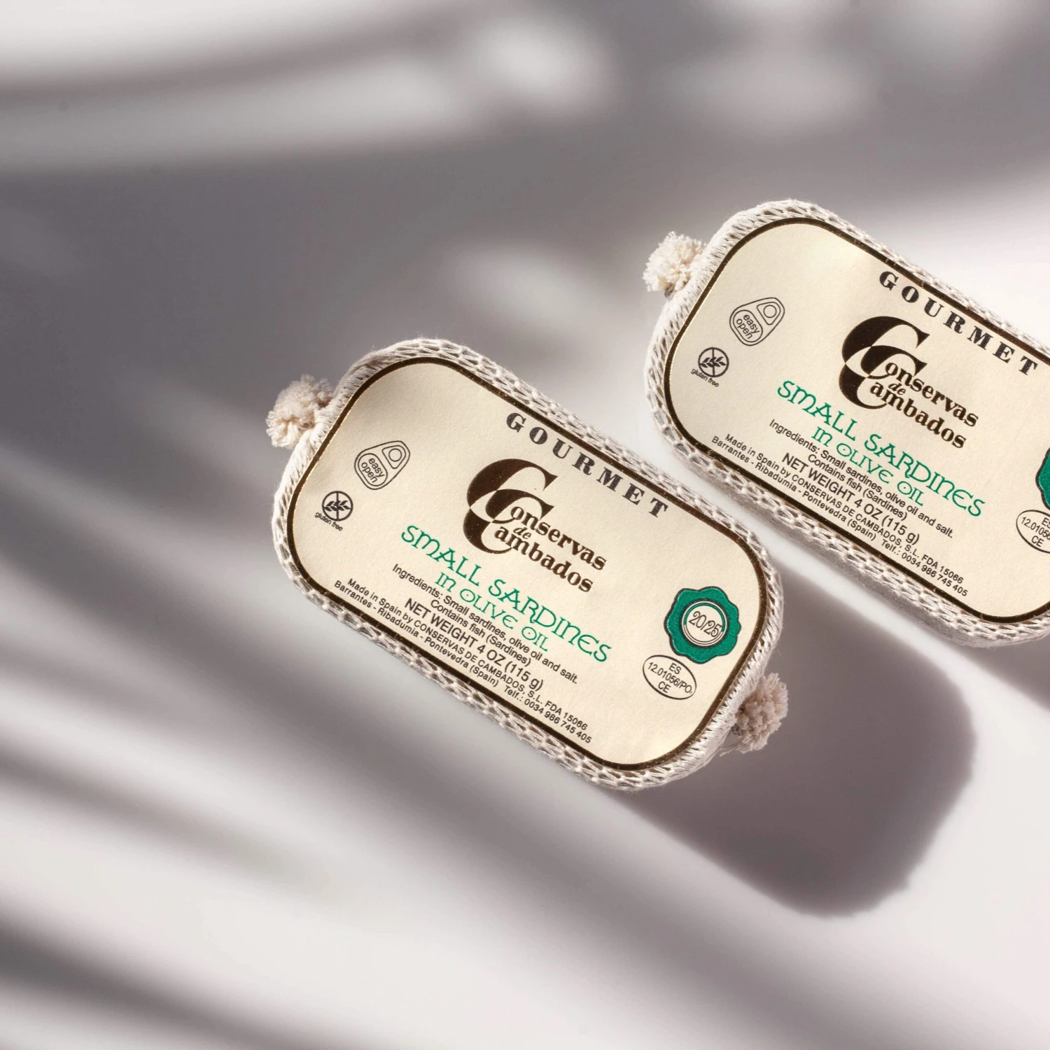Place of Origin: Spain[/accordions-break]We could tell these sardines were special the second we cracked the tin.[/banner_heading]With shockingly silver skins and delicate, pale flesh, these fish get more flavorful with time, as they’re aged with precision at Conservas De Cambados’ facility to absorb the richness of their olive oil marinade.[/banner-text-break]We love using tinned fish for a lovely light meal and these sardines are no exception. Serve simply atop toast or crackers, or a charcuterie board laden with nutty aged cheeses, bold chorizo or cured ham, fresh or dried fruit and other meaty bites. They’re also a great compliment to our Spanish Grilled Vegetables (Escalivada) or a leafy salad like our Celery and Frisée Salad (Amanida d’Api). The sardines also flavor rice dishes well and can serve as a milder substitute for anchovy fillets. And incorporating them into a rich and creamy spread is always a hit: Mash them up with cream cheese, butter, lemon juice, salt and fresh herbs like parsley or scallions and slather on a toasted bagel or crusty bread.[/how-to-use-break]Like shrimp, these sardines are classified on their tins by size: 20/25, which is the approximate number of sardines per pound. Tip: Warming your tinned fish before eating wakes up some of the flavors. Simply remove the outer packaging and open the can a small crack (to allow for building pressure to escape) and put them, tin and all, in a low oven to heat.