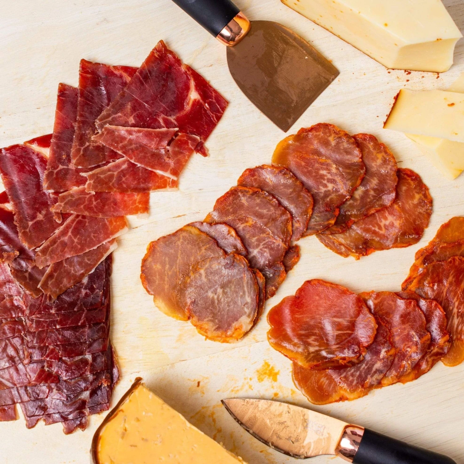 This sampler pack of thin-sliced Ibérico meats includes classic Jamón Ibérico ham as well as Lomo Ibérico, dry-cured pork loin. Similar to prosciutto but with a drier texture—which actually makes it less stringy and tough—Jamón Ibérico’s high fat content yields a sweet, decadent and intensely aromatic flavor. And slightly leaner Lomo Ibérico is nutty and meaty, with a touch of sweetness; smoky pimentón de la Vera (a type of Spanish paprika) and earthy garlic enhance the pork’s savory flavor, which is best served at room temperature to fully savor its complexity. Adhering to tradition, these artisanal meats are dry-cured in mountain air with only salt as a preservative during the curing process; a ham master decides by smell, sight and touch when the pork is perfectly done.