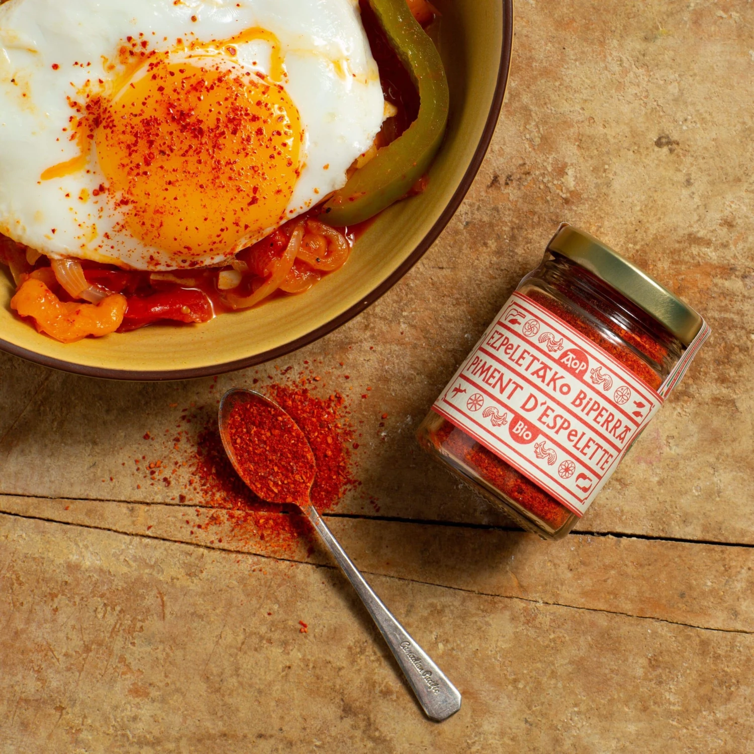 Place of Origin: France[/accordions-break]This chili powder is made from rare Espelette peppers, which are cultivated only in the French Basque region that includes just 10 villages.[/banner_heading] These are grown in Itxassou using sustainable and organic farming methods and fall under Europe’s AOP designation. This means that it must be grown and cultivated in from the town of Espelette or the surrounding towns.[/banner-text-break]With a sweeter, fruiter flavor than paprika, we love how this powder adds complexity to roasted potatoes and fries and an extra kick when tossed with marcona almonds. Sprinkle atop grilled fish and seafood like octopus or shrimp, or substitute in for the sweet paprika for our Piperade with Fried Eggs.[/how-to-use-break]