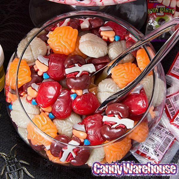 Freshly harvested from deceased giant gummy bears, these chewy internal organs feature an assortment of fruity flavors. Surgeons and anatomy students alike will enjoy munching on these delicious body parts. Perfect for Halloween party treats, this assortment includes brains, kidneys, hearts, and intestinal tracts. Each piece is wrapped.