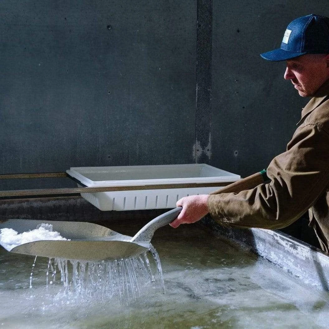 [/description-break] Ingredients [/title]Ingredients: Sea salt [/accordion] Specifications [/title]Net Weight: 1 poundPlace of Origin: Portland, Oregon[/accordions-break] Ben Jacobsen knows his product down to the granular level. Before starting Jacobsen Salt Co., he spent two and a half years in Denmark learning about salt production and traveled up and down the Pacific Coast hand-collecting and testing saltwater samples.[/banner_heading] Once he settled on the pristine Netarts Bay in Northern Oregon, Jacobsen designed a multi-step harvesting system for his sea salts. Ocean water is cooked down in custom pans and excess minerals are boiled off, resulting in a delicate, crisp sea salt with no bitter aftertaste. With every flake of salt carefully graded and sorted by hand, it’s no wonder that Jacobsen’s salts are favored by chefs [/banner-text-break]