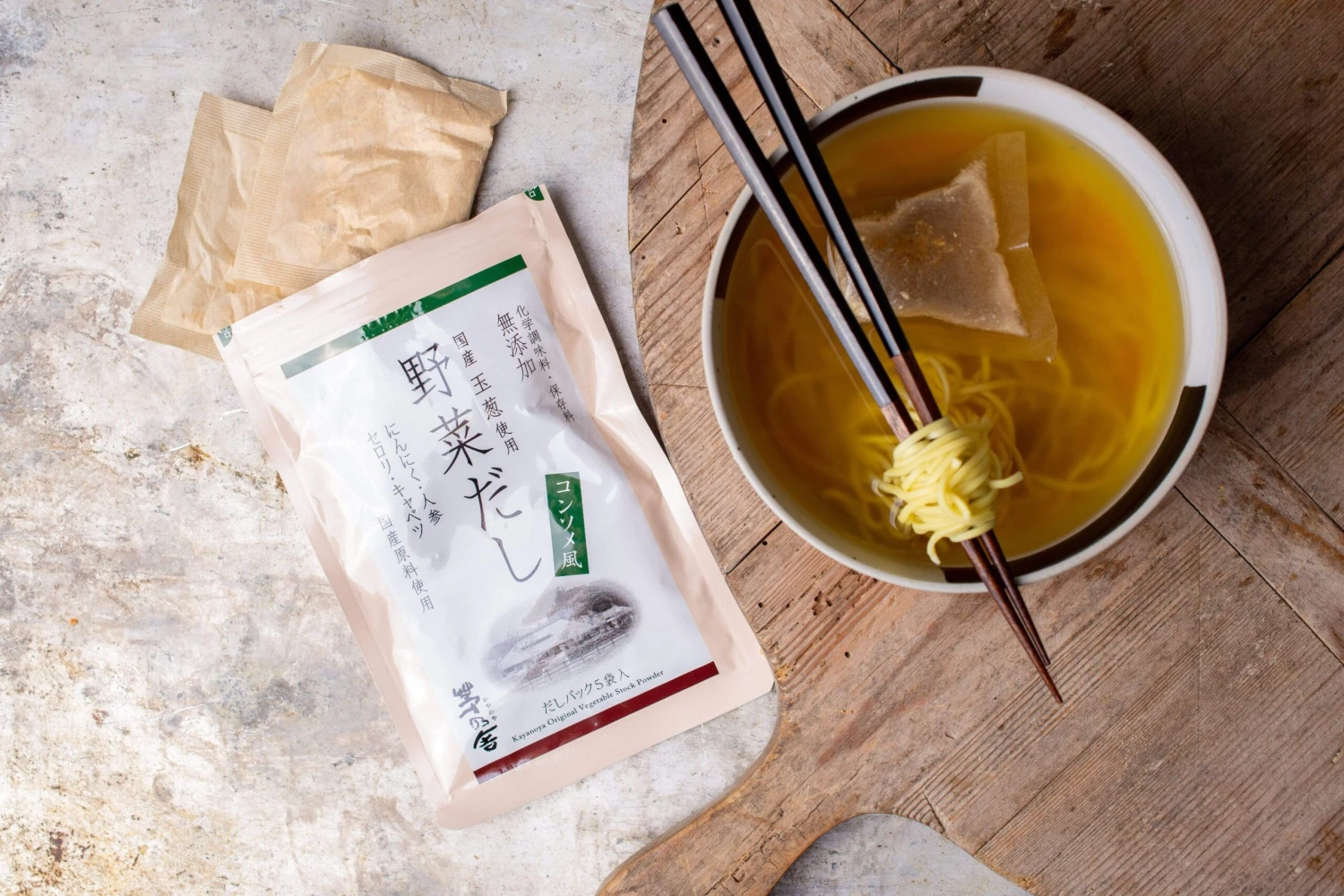 [/description-break] Ingredients [/title] Ingredients: Vegetable chips (onion, garlic, carrot), salt, yeast extract, vegetable extract powder (onion, celery, cabbage), starch hydrolysate, garlic powder.[/accordion] Specifications [/title]Product Includes: Five 8-gram packetsPlace of Origin: Japan[/accordions-break][/accordions-break]Kayanoya’s stock packets are designed much like tea bags and can be used in two ways.[/banner_heading]For a clear broth, place the stock packet intact in a pot of water; for a stronger, cloudy broth, tear the packet open and add the powder directly to the water. Either way, in just a few minutes the easy-to-use packets yield complex stock that tastes homemade.[/banner-text-break]Beyond soups and cooking liquid, we love this powdered stock as part of a spice rub; the oniony flavors would go well with everything from seafood to vegetables to meat.[/how-to-use-break]KITCHEN NOTES