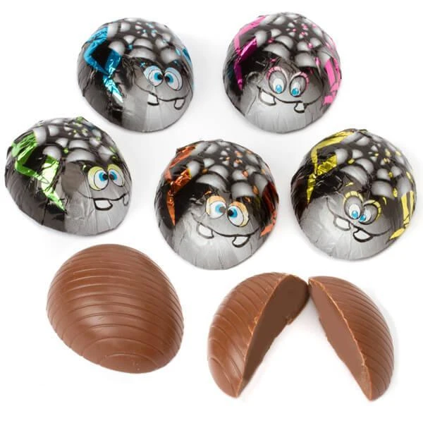 One of the most adorable spider collections ever! Creamy solid milk chocolate wrapped in colorful foil depicting “Spooky Spiders” that are so delightful, they are sure to scurry into mouths very quickly. Funny, silly goofy spider guys and girls peer up appealingly from a black and grey spider web body accented with shiny gold, green, purple, shocking pink, turquoise and orange foil spider’s legs. Every child and child-at-heart will be caught in the web of these delightful creatures.