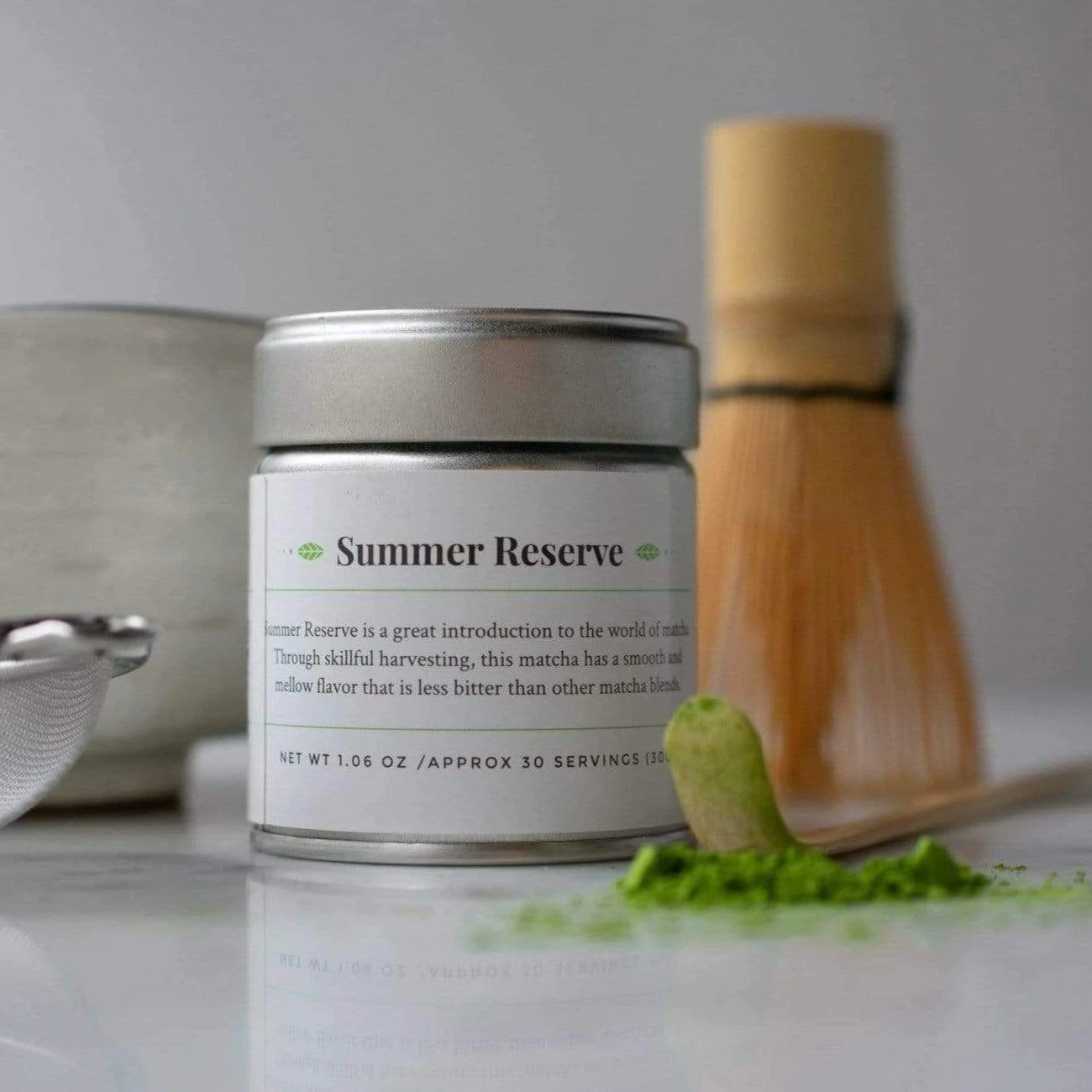 For the best experience, prepare matcha with traditional Japanese bamboo whisk in a small bowl. While not quite as effective, you can also use a handheld milk frother, a small blender, or even shake vigorously in a mason jar until the matcha is dispersed and frothy. [/how-to-use-break] Matcha is a powder that must be dispersed and suspended in liquid– it won’t dissolve completely. A bamboo whisk designed for matcha is the ideal way to achieve a smooth cup with a delightful amount of froth.
