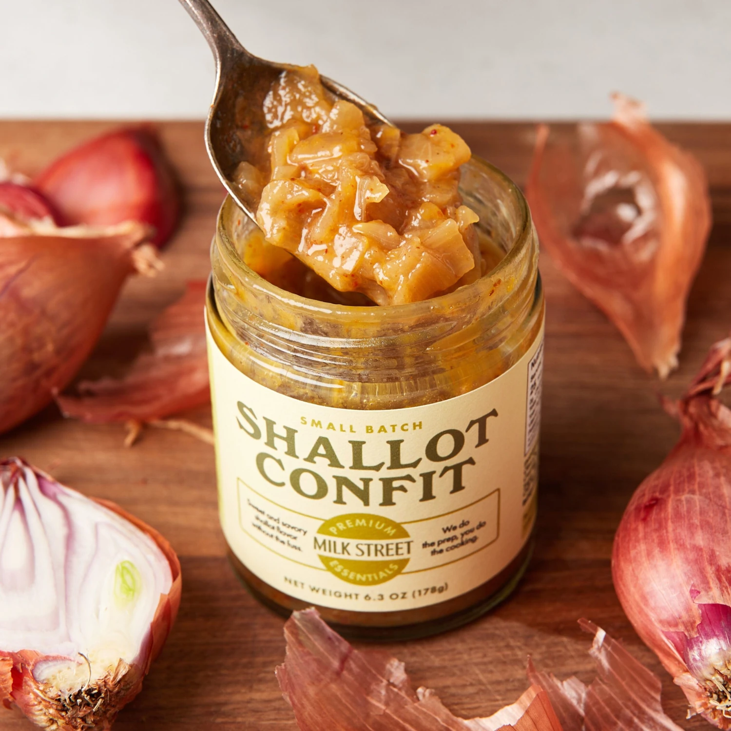 Milk Street Premium Essentials Shallot Confit is a rich-tasting blend of minced shallots, olive oil and ghee simmered slow and low to a deep, savory flavor and jammy texture. White wine, bay leaf and a touch of spice add dimension to boost any cuisine. It’s designed to be all-purpose enough to replace cooked shallots in virtually any recipe. Try in soups, stews, sauces and sauces. Fold into grains or beans, spread inside grilled cheese and paninis, top burgers or dollop on to pizza. It saves valuable time and effort, getting a flavorful dinner on the table faster.