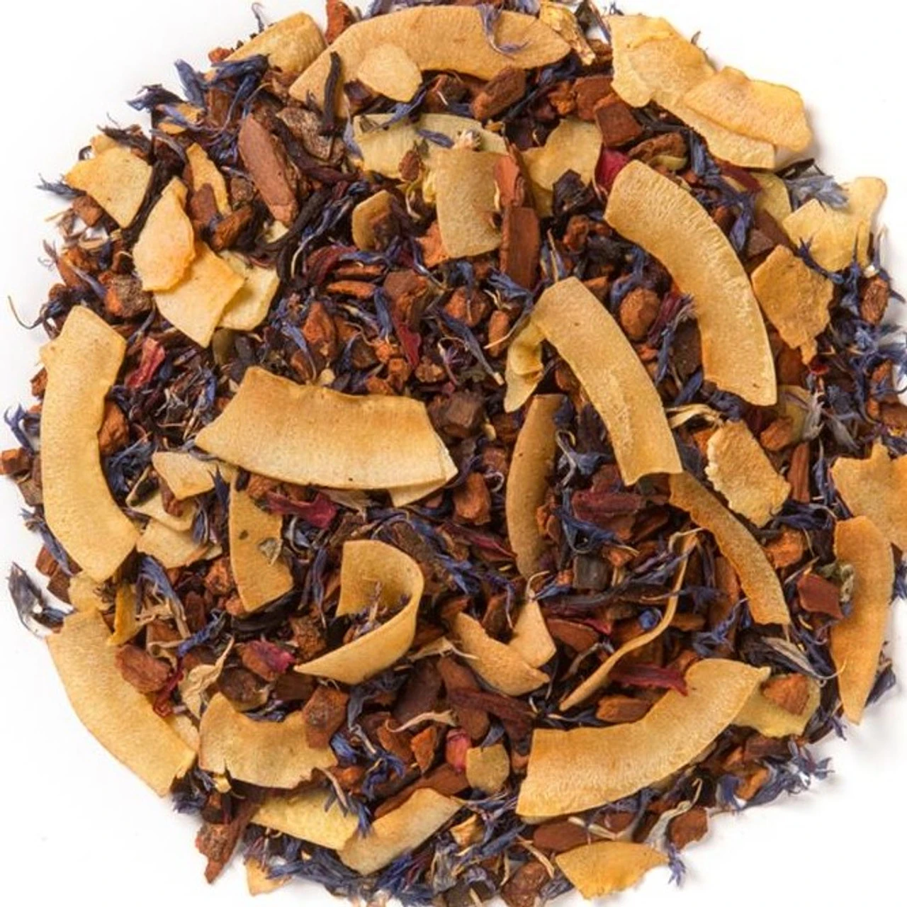 A magnificent caffeine-free all organic blend of dried coconut, hibiscus, cornflowers, natural flavors, a touch of peppermint and some cinnamon for warmth. A delicate, warming brew with a floral, minty base and a spicy finish.