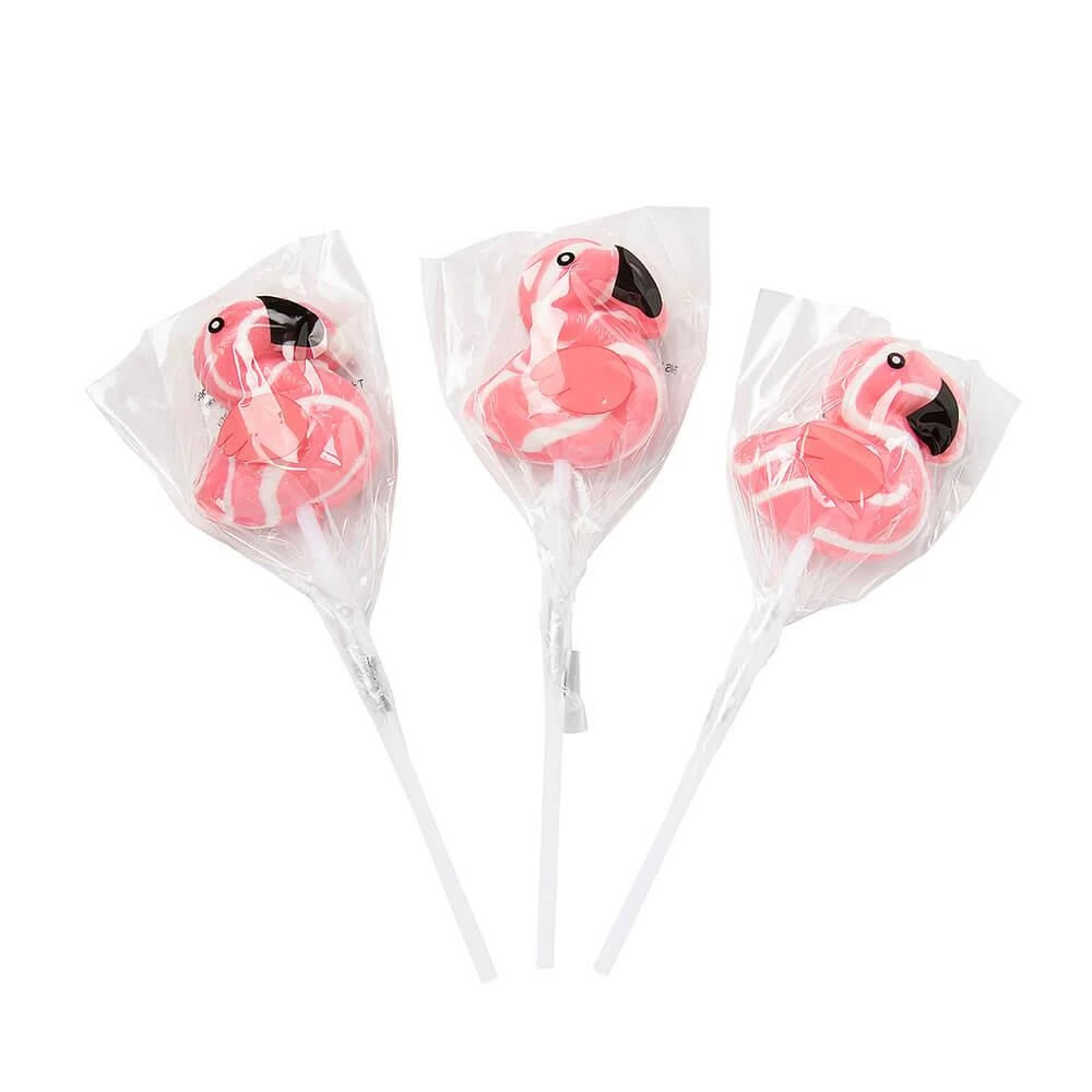 Box contains 12 wrapped Flamingo Shaped Swirl Pops.