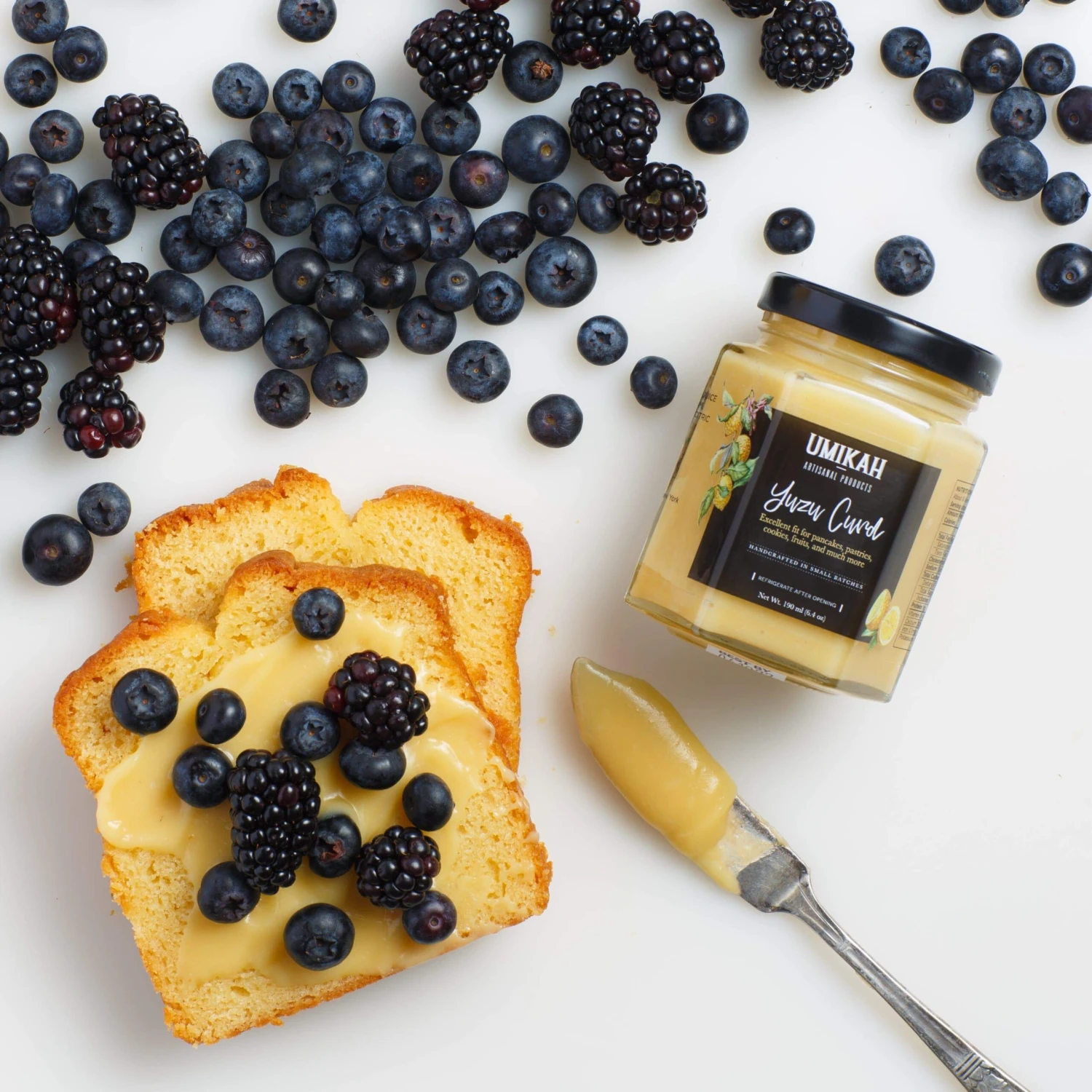 Umikah’s yuzu curd has a remarkably refreshing citrus flavor, filled with tart, tangy notes and very little bitterness–something other yuzu products tend to have too much of. The juice of this Japanese citrus fruit is pungent and floral, evoking grapefruit, mandarin and lime flavors that don’t get muddied in this simple curd. Creamy and silky, but not too thick or eggy, it is excellent on pound cake, with berries, as a filling for pies, cakes and desserts, or simply on a spoon.